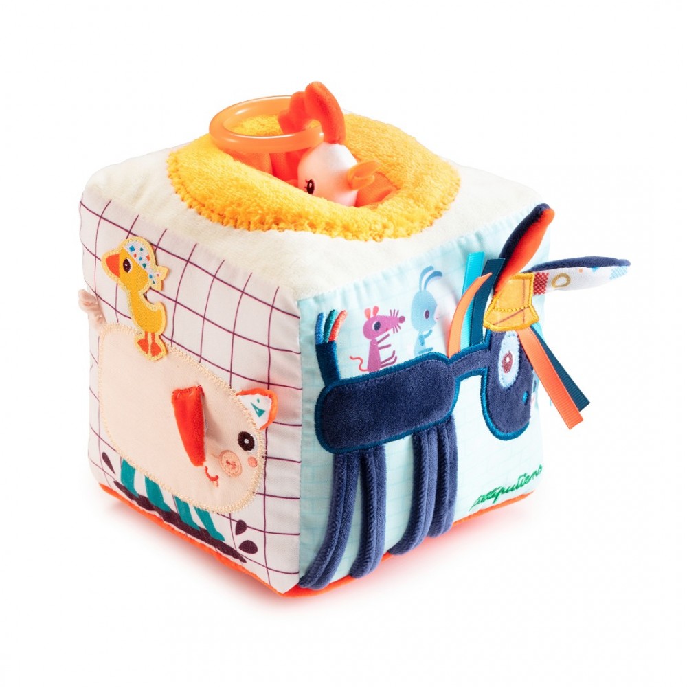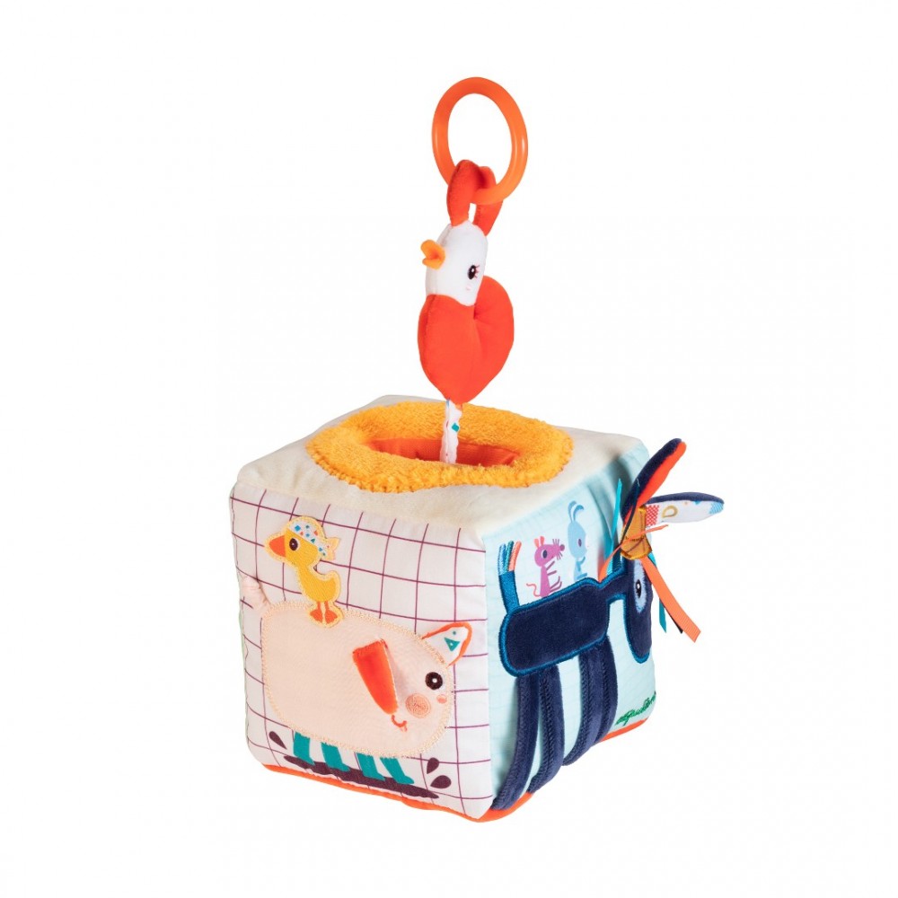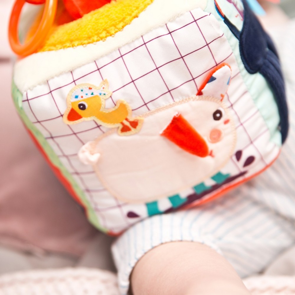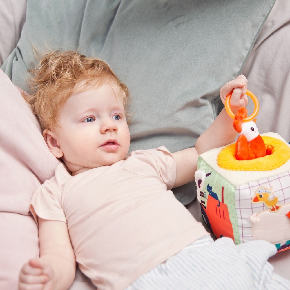 Ova aktivna kocka je odlična za senzornu stimulaciju i razvoj fine motorike jer motivira djecu da koriste prstiće i ruke za istraživanje različitih elemenata kocke. Kocka često uključuje i ogledalo ili sigurne reflektirajuće površine, što dodatno potiče djetetovu znatiželju i samosvijest.