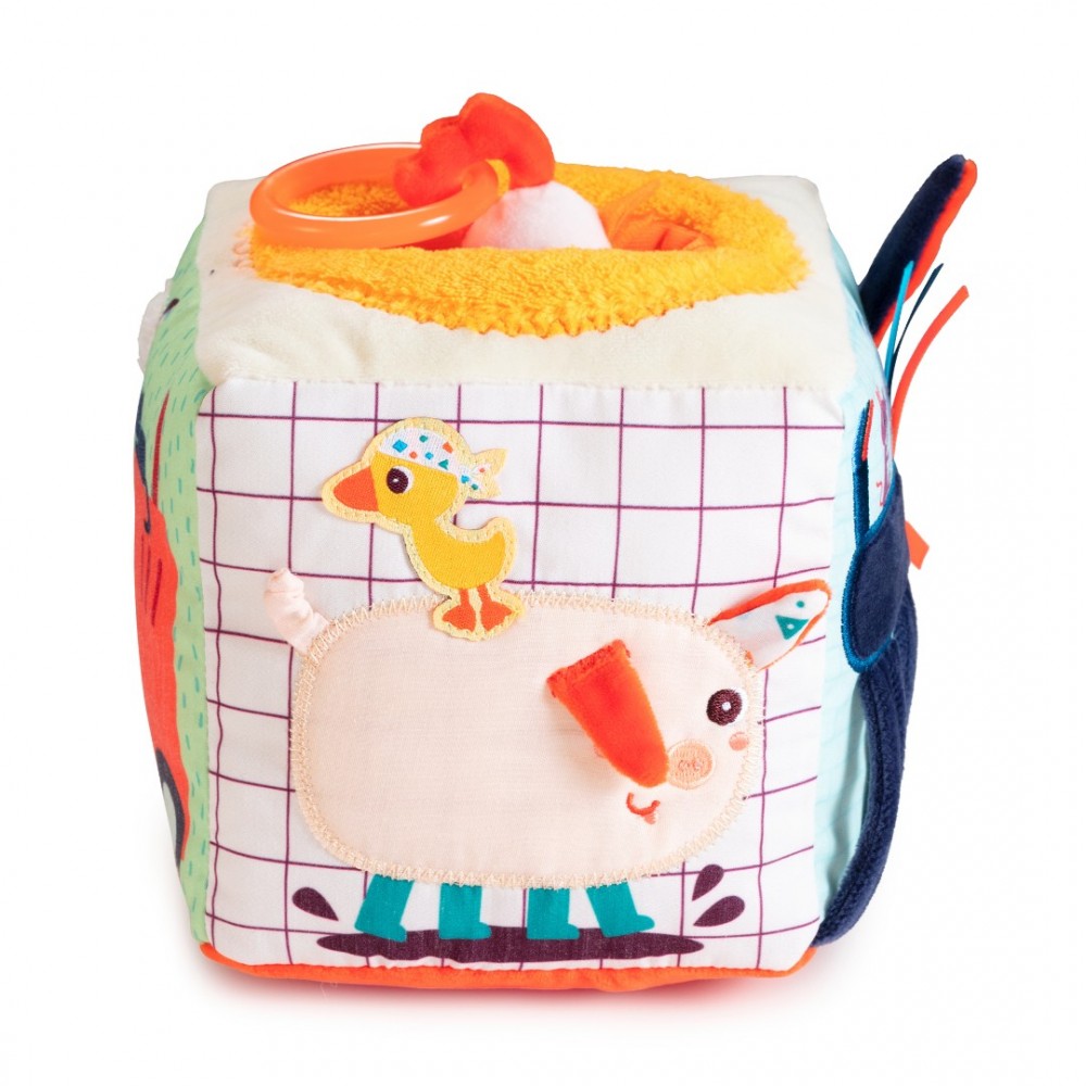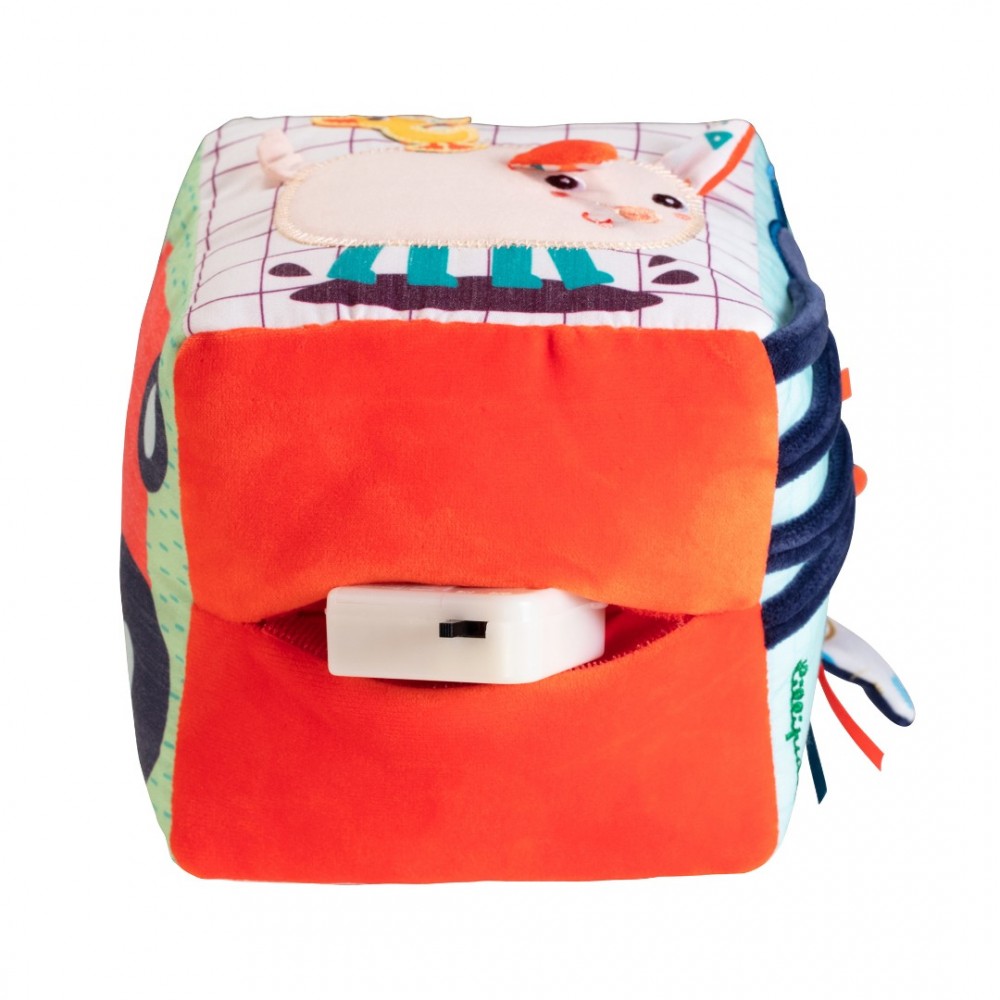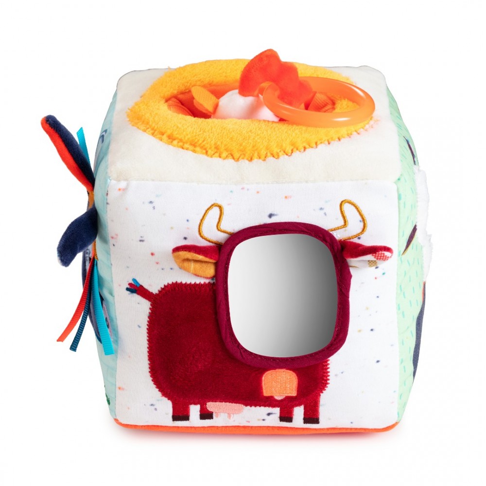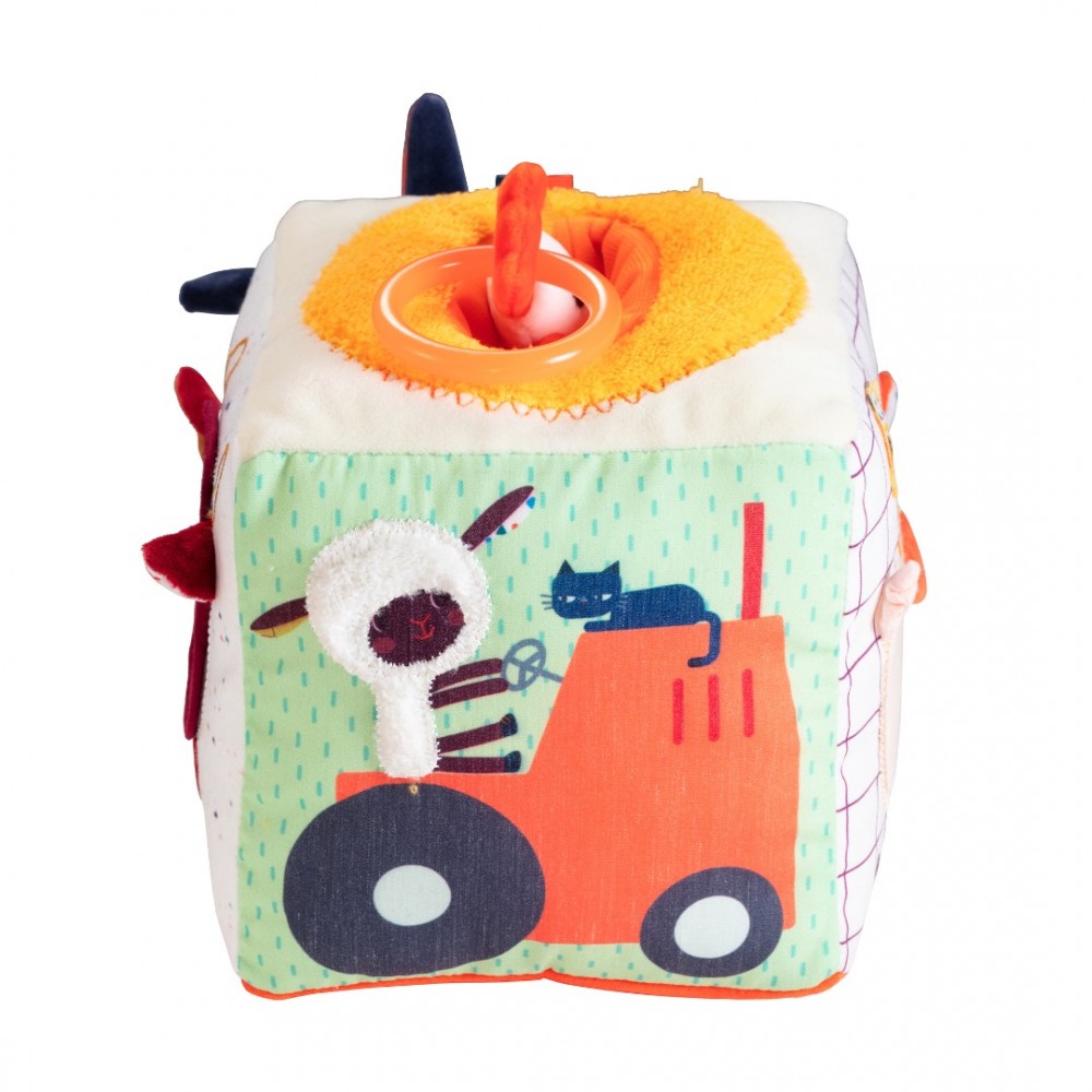 Aktivna glazbena kocka Farma je šarena i interaktivna igračka s motivom farme koja pruža sate zabave i učenja za najmlađe. Svaka strana kocke ima različite elemente – teksture, zvukove, životinjske motive i mehanizme za istraživanje, pa djeca mogu zveckati, povlačiti, prisluškivati, pritiskati i osluškivati zvukove farme, potičući sva osjetila dok se igraju.