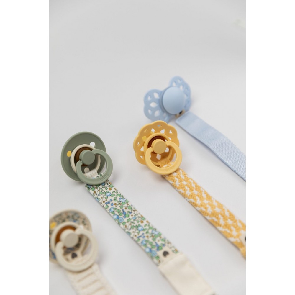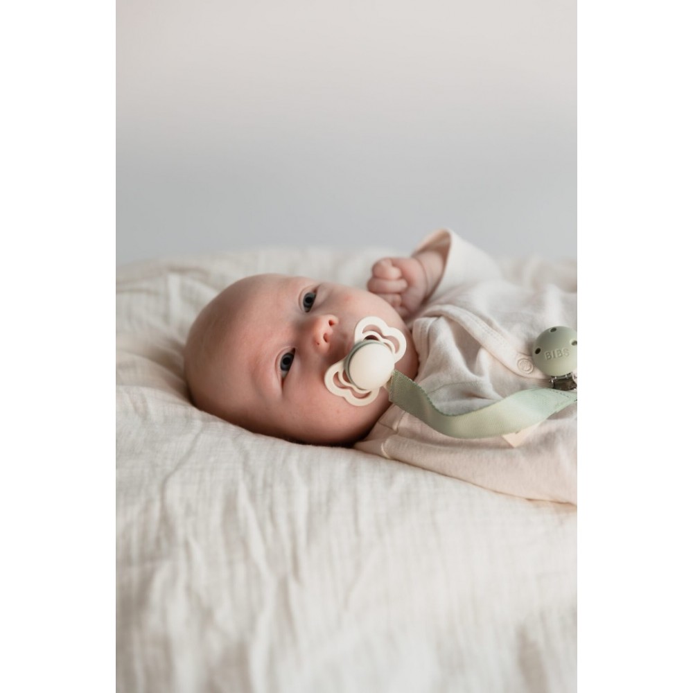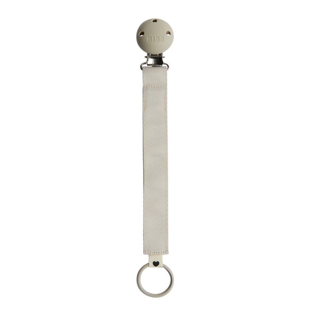 Izrađena od izdržljive poliesterske trake, s fleksibilnim silikonskim prstenom i kopčom s metalom bez nikla, ova traka osigurava sigurnu i jednostavnu upotrebu. Moderan i neutralan Sand dizajn lako se uklapa uz sve BIBS dude i dječje kombinacije.