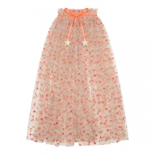 Čarobni plašt Duga unosi šarenilo i čaroliju u svaku dječju igru! Ovaj veseli plašt ukrašen je printanim dugama i zvijezdama, izrađen od višeslojnih tkanina u živim bojama, te je opremljen zatvaračem s gumbićem i satenskom vrpcom s privjescima koji dodatno inspiriraju igru i maštovitost.