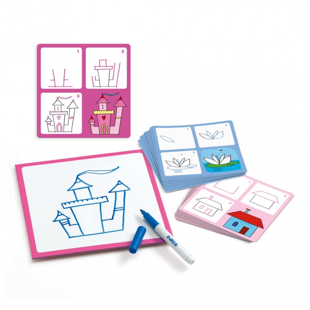 Svaka kartica ima 4 skice s jedne, i 4 skice s druge strane na kojima se redom prikazuje kako nacrtati princezu Josephinu, njezino društvo, ili pak dvorac i kočiju. Nakon što vaše djevojčice nacrtaju svoje crteže, potrebno ih je i obojati. U svemu tome pomoći će im brisiva ploča, brisivi marker te suha krpica za brisanje, koji su također dio ovog seta.