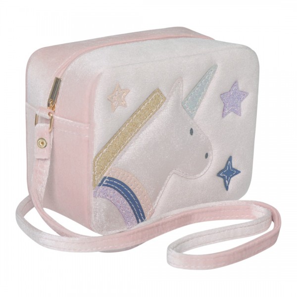 Mimi & Lula omiljena torbica sada dolazi u mekanom velvetu, s glitter rogom i šarenom pastelnom trakom koja oponaša jedinstvenu grivu jednoroga. Torbica je dimenzija 20 x 1 x 23 cm, s praktičnim patentnim zatvaračem za sitnice, a podesivi remen duljine cca 48 cm čini je udobnom za nošenje. Izrađena je od kombinacije mekog velura, glitter i metaliziranih tkanina te višebojnih traka, što je čini savršenim poklonom za svaku priliku ili veselim dodatkom svakodnevnim frizurama i outfitima.