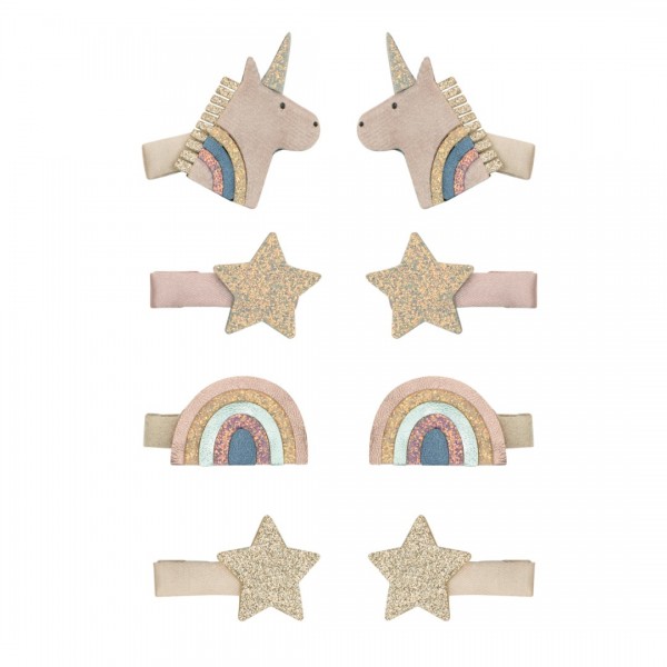 Dječje mini špangice Jednorog unose magiju i veselje u svaki dan. U pakiranju dolazi 8 špangica veličine 3 cm s aligator kopčama obloženima vrpcom, ukrašenih preslatkim motivima jednoroga, duga i zvjezdica izrađenih od kombinacije mekog baršuna, šljokica i metalik tkanina u nježnoj paleti ružičastih i pastelnih nijansi. Savršene su za male sanjarice koje vole blistave i razigrane dodatke, idealne za igre, posebne prilike ili svaki dan kada žele zasjati.