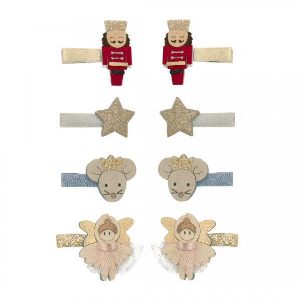 Set sadrži osam špangica (dugačkih 3 cm), obloženih vrpcom i ukrašenih sitnim Orašarima, vilama, mišićima i svjetlucavim zvjezdicama – savršeno izrađenima od kombinacije mat i šljokičastih materijala.