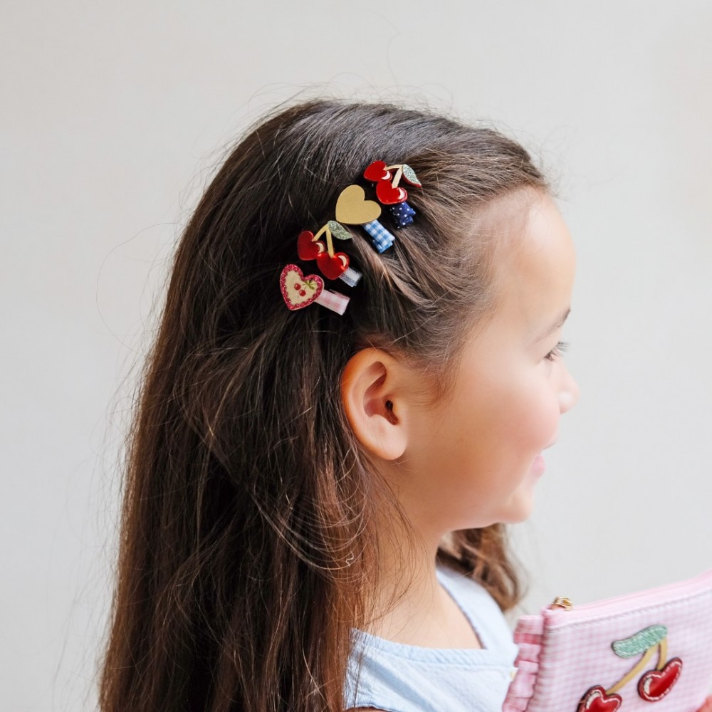 Ove šarmantne mini špangice dizajnirane su s veselim motivima trešanja koji unose razigran i sladak detalj u svaku dječju frizuru. Inspirirane popularnim voćnim uzorcima koji su čest motiv u dječjim modnim dodacima, mini špangice su lagane, udobne za nošenje i savršene za svakodnevne stylinge ili posebne prilike.