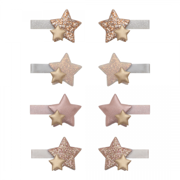 Set sadrži osam špangica (3 cm) s kopčama, ukrašenih slojevitim zvjezdicama od metalik i šljokičastih materijala koje sjaje poput pravih zvijezda.