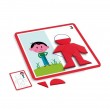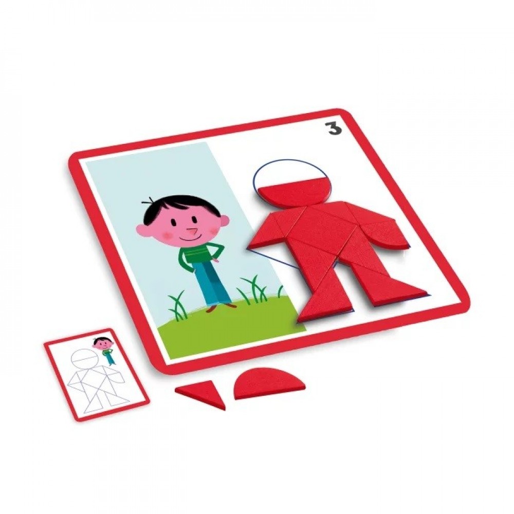 Set sadržava 12 kartica oslikanih s 2 strane s predlošcima, 12 kartica s rješenjima i 36 drvenih dijelova za slaganje.