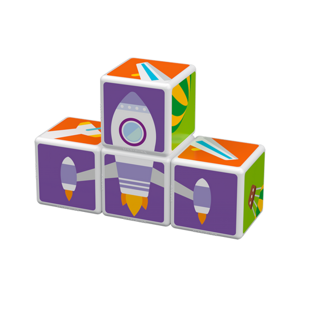 Geomag Magicube Printed Transport + Cards 7 je edukativni set namijenjen najmlađima — sadrži 4 magnetske kocke s ilustracijama prometnih sredstava i 3 dvostrane kartice s uzorcima za slaganje.