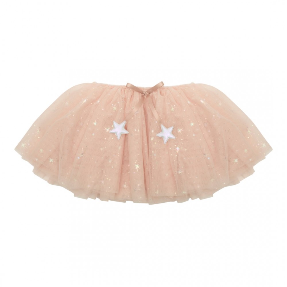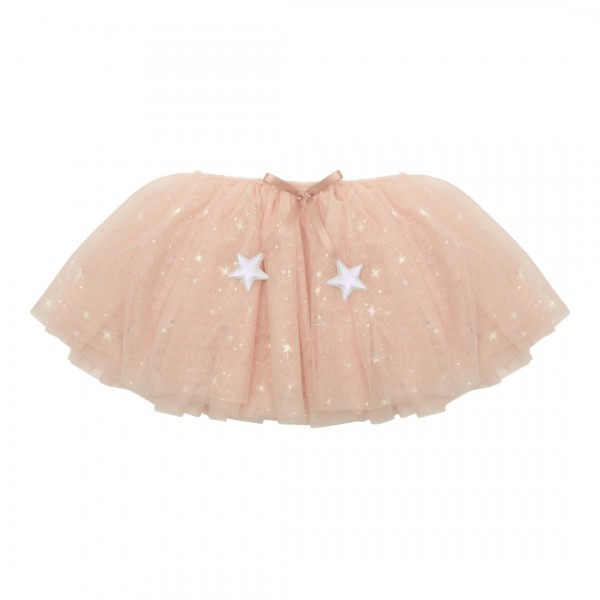Lagana i pahuljasta, izrađena od slojeva nježnog ružičastog tila posutog sjajnim metalik zvjezdicama, ova suknja unosi dašak bajke u svaki dan. Savršena je za maštovite igre, ples, rođendanske proslave ili maskenbale, a lako se kombinira s plaštom i šeširom Princeza za potpuni vilinski izgled.