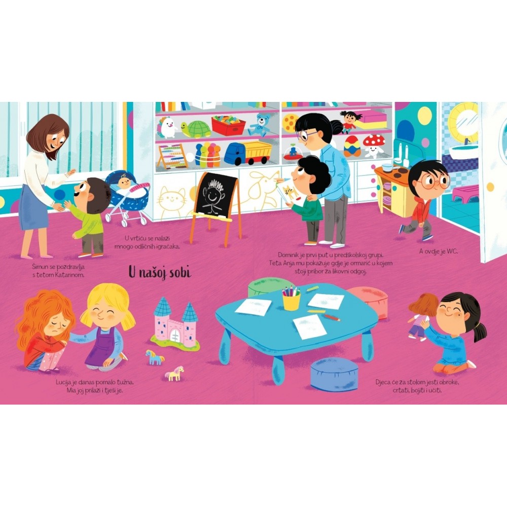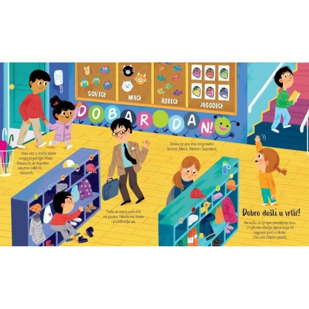 U ovom zabavnom i poučnom naslovu malena djeca upoznat će se s time kako izgleda dan u vrtiću, a predškolarci će prepoznati svakodnevne situacije. Na svakoj su stranici prikazane uobičajene aktivnosti u vrtiću, u koje su uključena djeca, roditelji i odgojiteljice te se na taj način mališane priprema za vrtić i razrednu nastavu.