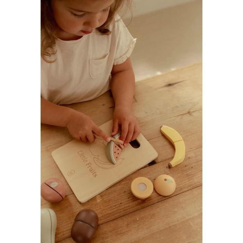 Little Dutch drveno voće zabavan je i kreativan drveni set koji omogućuje djeci da ponašaju male kuhare i igraju se pripreme zdrave hrane. Set uključuje šest različitih komada voća — poput banane, kruške, kivija, naranče, lubenice i jabuke — zajedno s daskom za rezanje i malim drvenim nožem, tako da se voće može “prerezati” na pola i ponovno spojiti zahvaljujući čičak trakovima.