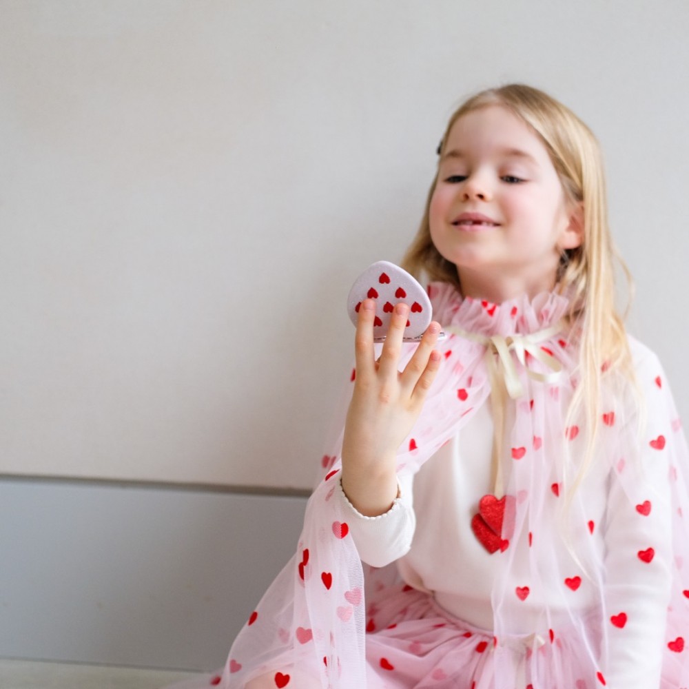 Preslatko malo kompaktno ogledalo s motivom srca idealan je dodatak za male princeze koje vole lijepe detalje u svojoj torbici ili ruksaku. S promjerom od oko 7 cm, lagano je za držanje i savršeno za provjeru frizure ili šminke tijekom igre ili izleta.