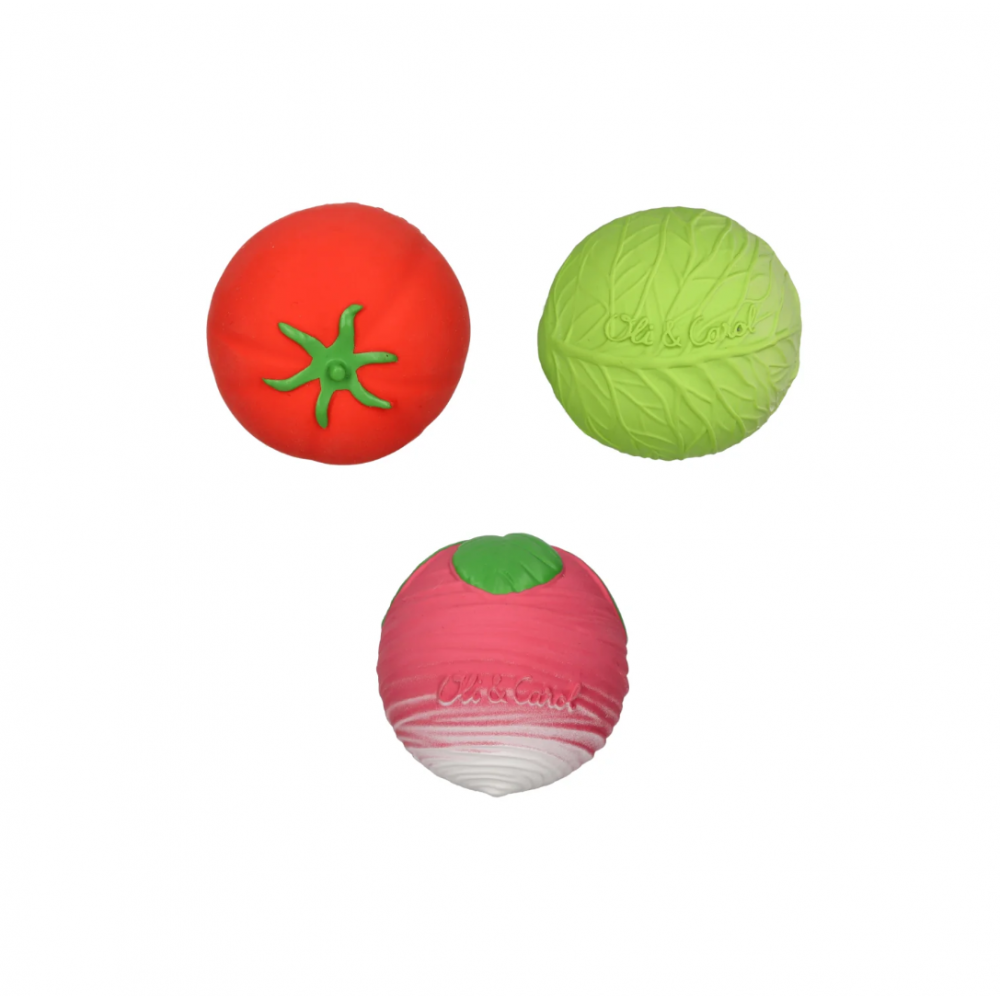 Senzoričke loptice Oli&Carol – Povrtna salata donose zabavnu i edukativnu igru inspiriranu zdravim povrćem. Set uključuje tri loptice u obliku povrća poput rajčice, rotkvice i kupusa, osmišljene za male dječje ruke i istraživanje kroz igru.