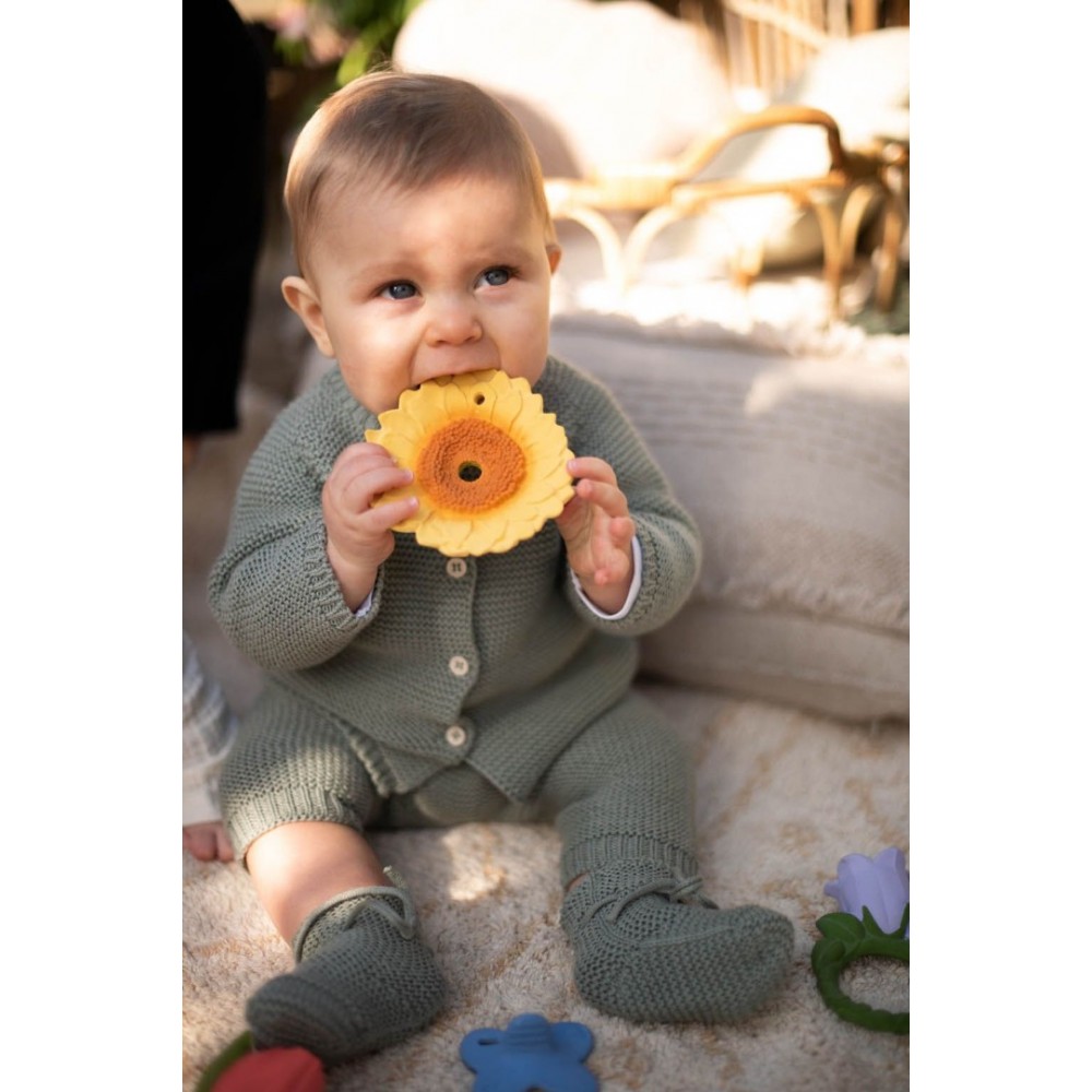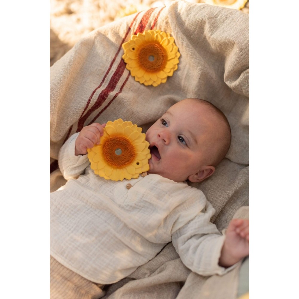Oli&Carol suncokret “Sun” je mekana i sigurna žvakalica-igračka u obliku suncokreta, osmišljena za najmlađe. Savršena je za vrijeme nicanja prvih zubića — djetetu nježno masira desni i umiruje neugodu. Zahvaljujući prirodnom lateksu, laganoj teksturi i ergonomskom obliku, lako je držati u malim ručicama, a rupe u dizajnu omogućuju da se žvakalica objesi na lančić — idealno za igru na putu ili u kadi. Također je pogodna za igru u vodi, bez opasnosti od nakupljanja bakterija ili plijesni.