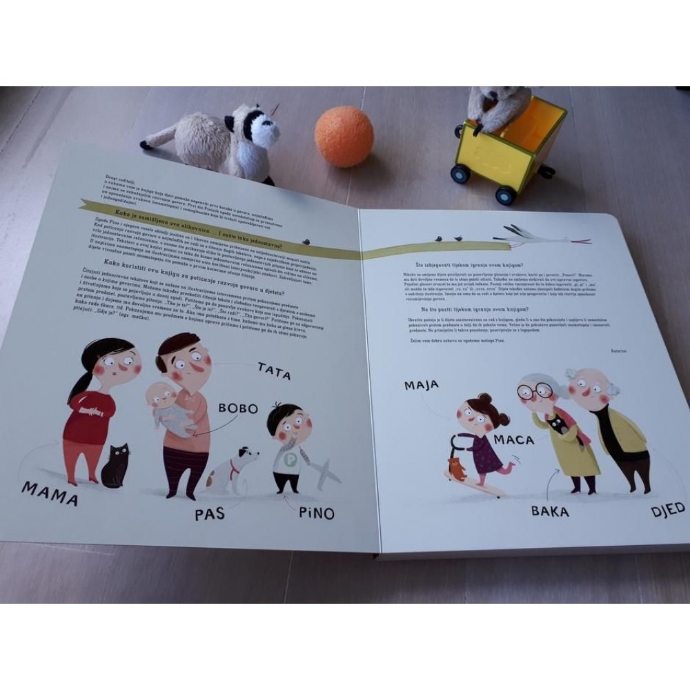 Knjiga je prilagođena bebama od približno 6 mjeseci starosti te djeci sa sporijim razvojem govora. Priče o Pinu i njegovoj obitelji prikazane su vrlo jednostavno kako bi roditelji kroz razgovor, pokazivanje i ponavljanje zvukova poticali dijete na prve pokušaje govora.