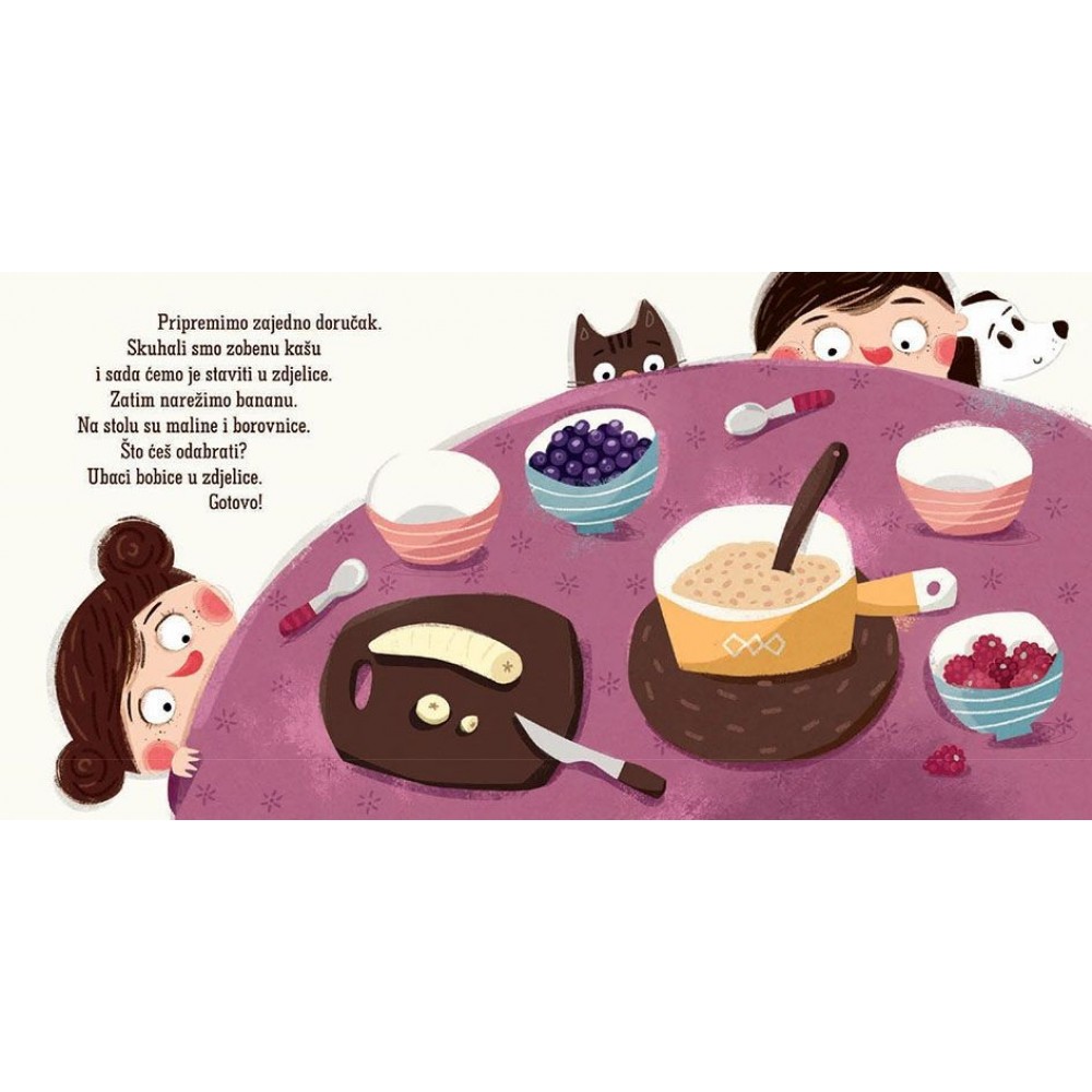 Ova interaktivna kartonska slikovnica uključuje male zadatke na svakoj stranici kako bi dijete aktivno sudjelovalo u priči. Na zabavan način potiče razvoj govora, fine motorike i usvajanje svakodnevnih navika poput jutarnjeg spremanja i brige o kućnim ljubimcima.