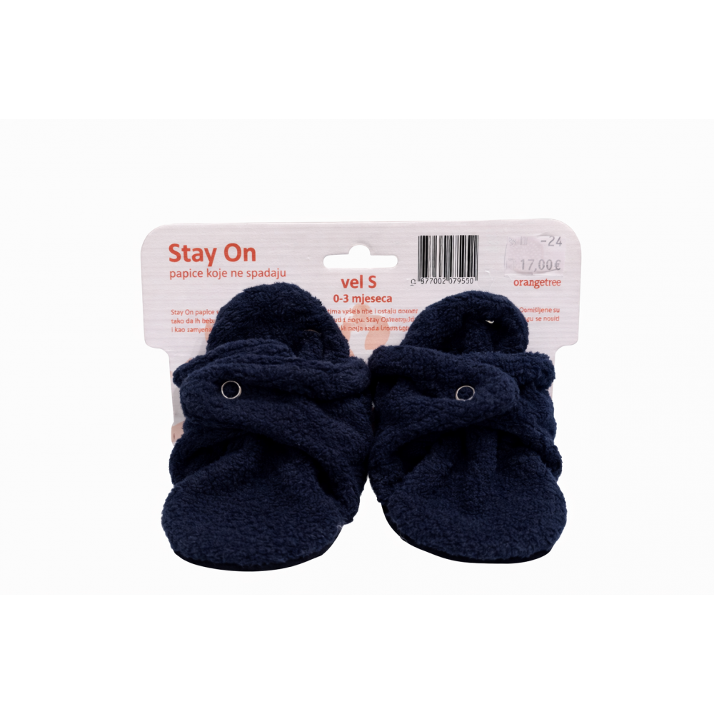 Papuče za bebe Stay On pružaju udobnost a uz to izgledaju preslatko,papice uspješno odolijevaju svim pokretima bebe i ostaju na njenim neumornim nogicama. Mekane su kao čarape, ali nisu klasične čarape. Oblikovane su kao obuća, ali nisu ni cipele. Mogu se nositi na bosu nogu, ali i preko čarape. Mogu se koristiti u kući, ali i u šetnji u kolicima.