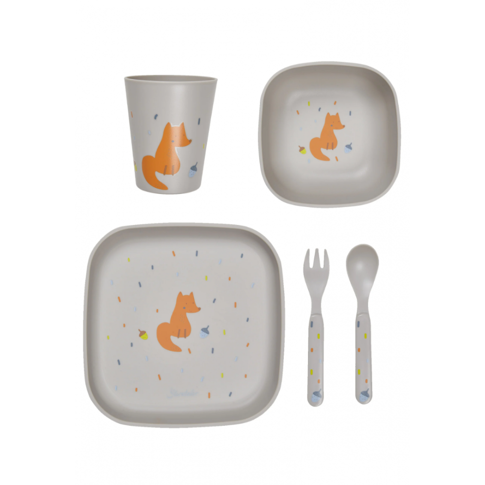 Izrađeno od izdržljivog polipropilena, sigurno za hranu i bez BPA. Set se sastoji od 5 dijelova: tanjur, zdjela, šalica, žlica, vilica.