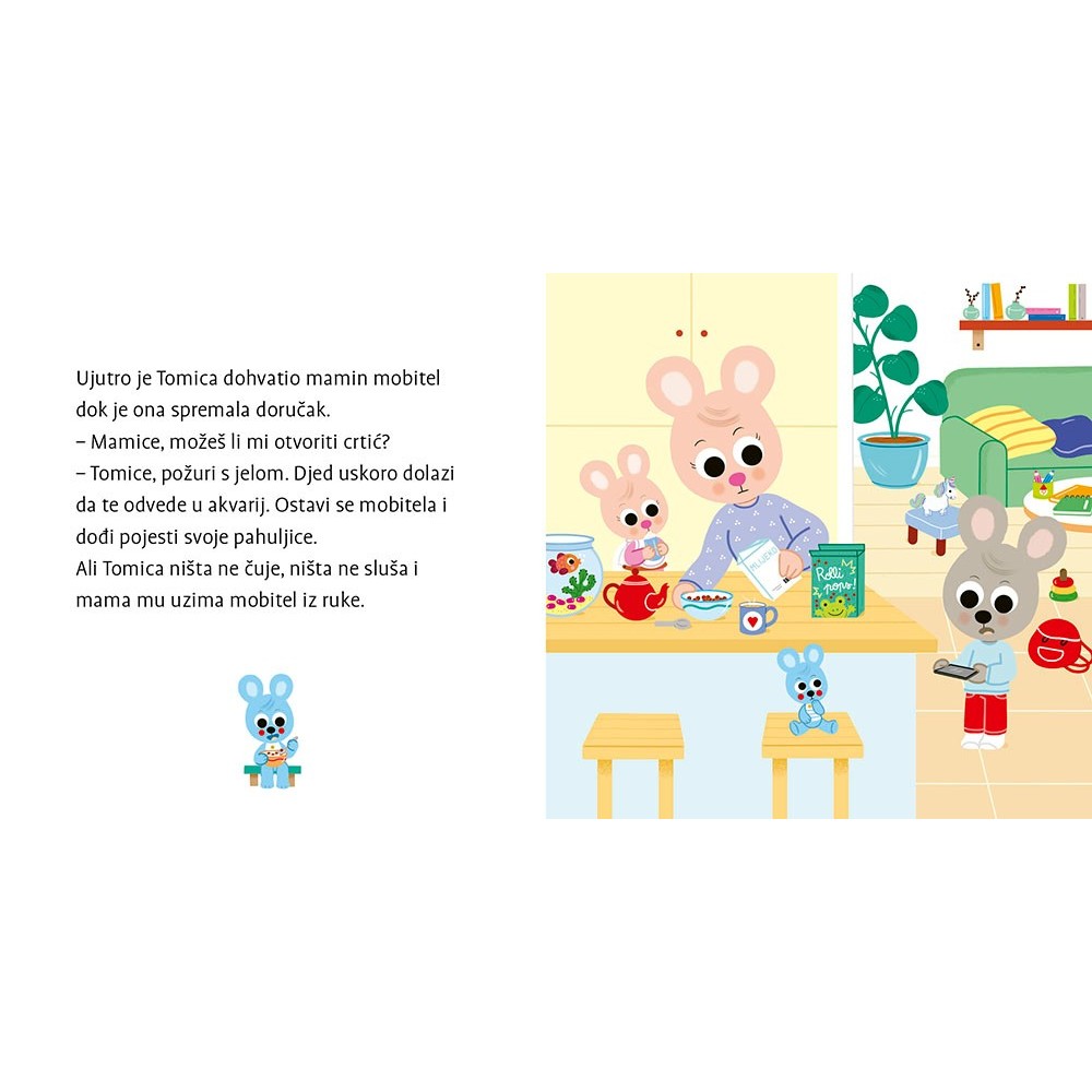 Slikovnica Tomica i ekrani prati simpatičnog zečića Tomicu kroz svakodnevne situacije povezane s pretjeranim korištenjem televizije, mobitela i igrica. Od gledanja crtića prije spavanja do igranja na telefonu za doručkom, Tomica postupno otkriva koliko ekrani mogu utjecati na njegovo ponašanje i igru s prijateljima.