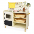 Ova velika drvena kuhinja pruža djeci prostor za igru uloga — mogu “kuhati”, peći, prati posuđe i slagati obroke uz 16 dodataka poput lonca, tave, začina pa čak i ukrasnog cvijeta u vazi. Velike dimenzije i realistični elementi (poput pećnica s magnetskim vratima, okretnih gumba za sudoper i prozora za “pranje povrća”) stvaraju autentično iskustvo koje potiče kreativnost.